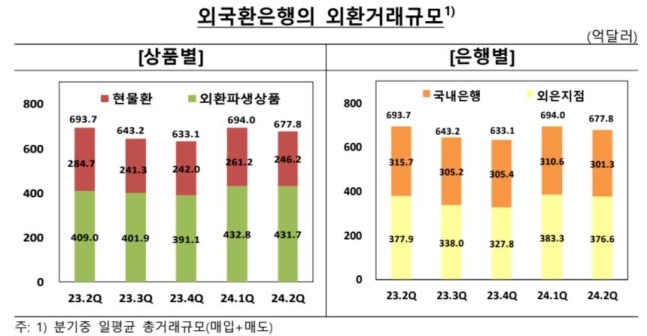 , ” According to the ‘Foreign Exchange Transaction Trends of Foreign Exchange Banks in the Second Quarter’ released by the Bank of Korea on the 23rd, the average daily foreign exchange transactions (spot transactions and foreign exchange derivative transactions) for the period totaled $67.78 billion.”,