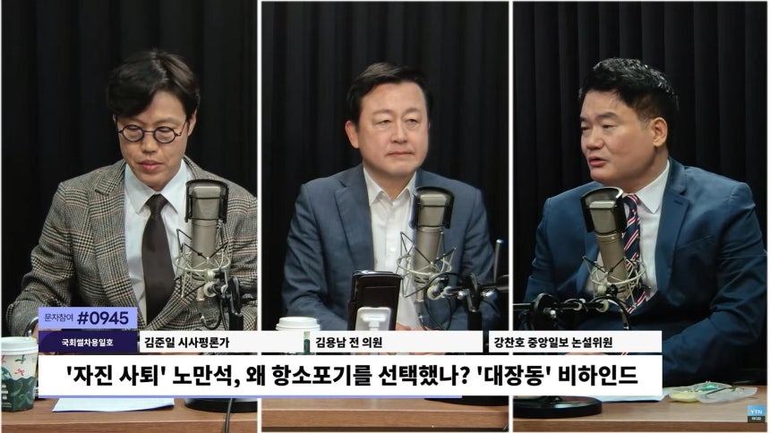 , “◆ Kim Young-soo: We will start the full-scale political talk ‘National Assembly Train Yong Il-ho’ that we meet on Thursdays on . How do our listeners view the prosecution’s decision to give up the appeal? Both the chief prosecutor of the Central District and the acting prosecutor general have offered to resign. Former lawmaker Kim Yong-nam, current affairs critic Kim Jun-il, and Central Daily editorial writer Kang Chan-ho are with us. Welcome. I’m very curious to know how the three of you see the prosecution’s decision to forgo the appeal. Who do you think made this decision?”,