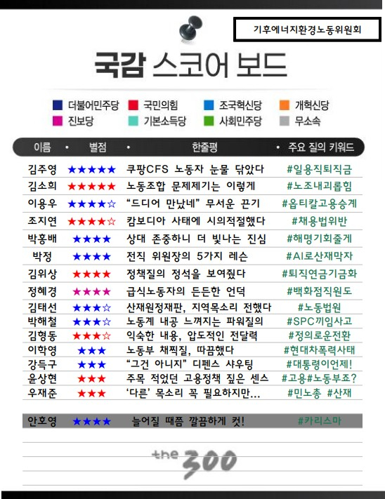 , “This year’s Labor Ministry audit by the National Assembly’s Climate, Energy, Environment, and Labor Committee was marked by the tenacity of its members. It led to substantial changes in labor conditions, such as Coupang Fulfillment Services (CFS) deciding to revert its controversial ‘reset’ rule in response to persistent parliamentary pressure about the unpaid retirement benefits for temporary workers.”,