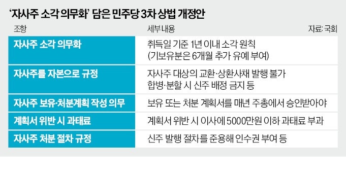 , The amendment also includes a provision for a fine of up to 50 million won against directors personally if the principle of cancellation within a year is not adhered to or if the approved Treasury Stock Retention and Disposal Plan is violated. The Democratic Party plans to pass the bill within the year.’,